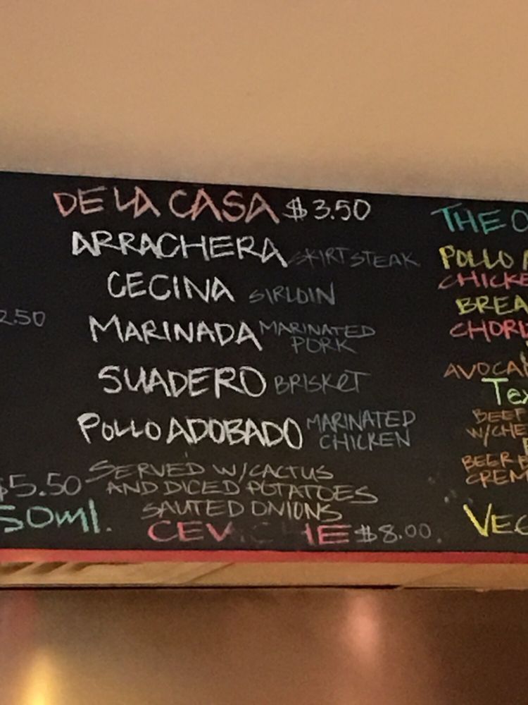 Marinated chicken. Served with nopales or papas and grilled onions.